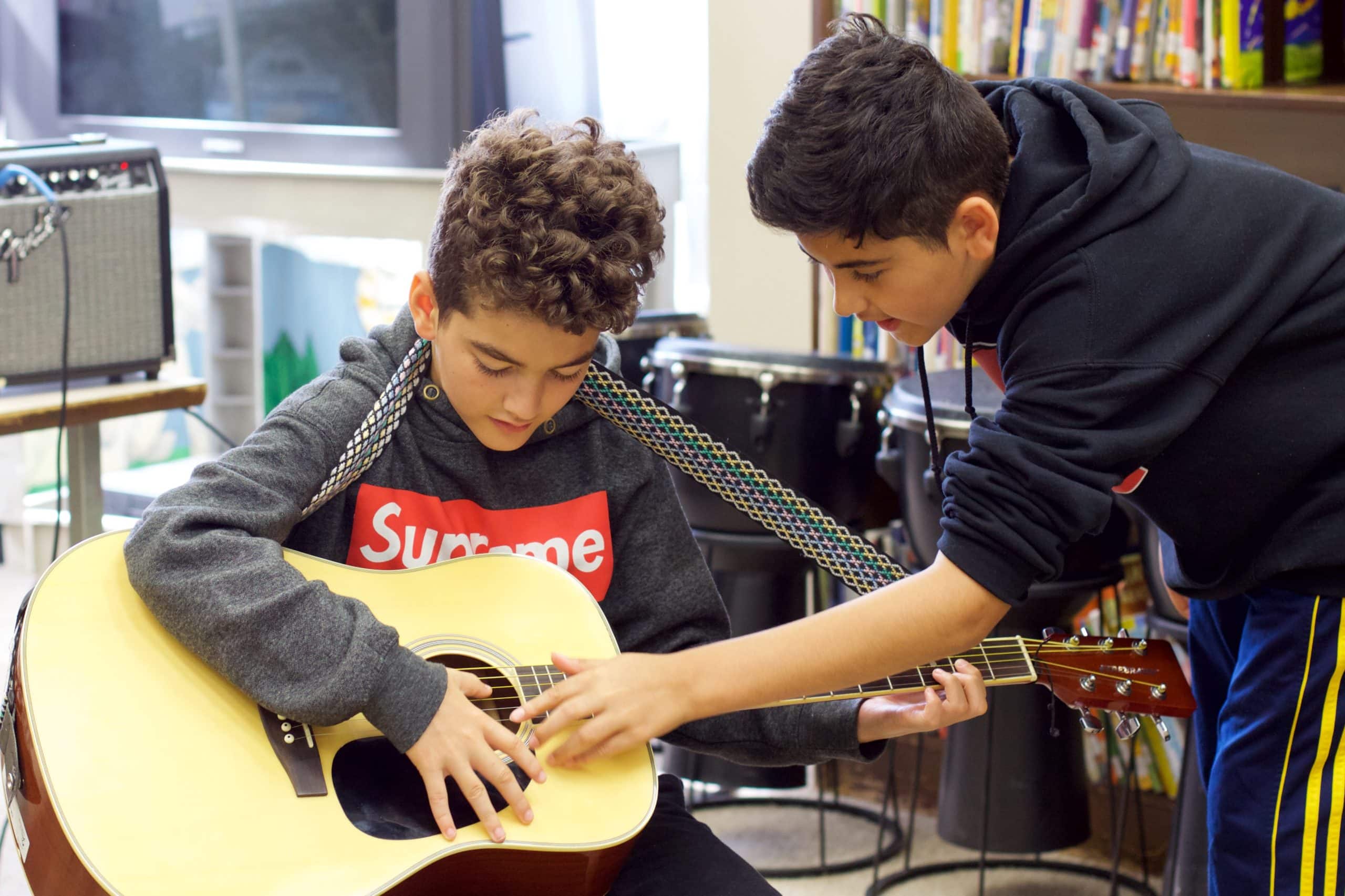 As we are nearing the end of camp and the children are working to perfect what they’ve learned, we’ve witnessed an increased display of teamwork. Campers are helping each other strum the right notes on their ukuleles and showing those who were absent what they missed. Groups are working together to create their own piece for the performance. “We’ll work on the lyrics while you practice the solo drumming part.” “You can do it! You can create a drum a solo too. I can help if you want.” We are proud of how the children are working together to create a successful performance.